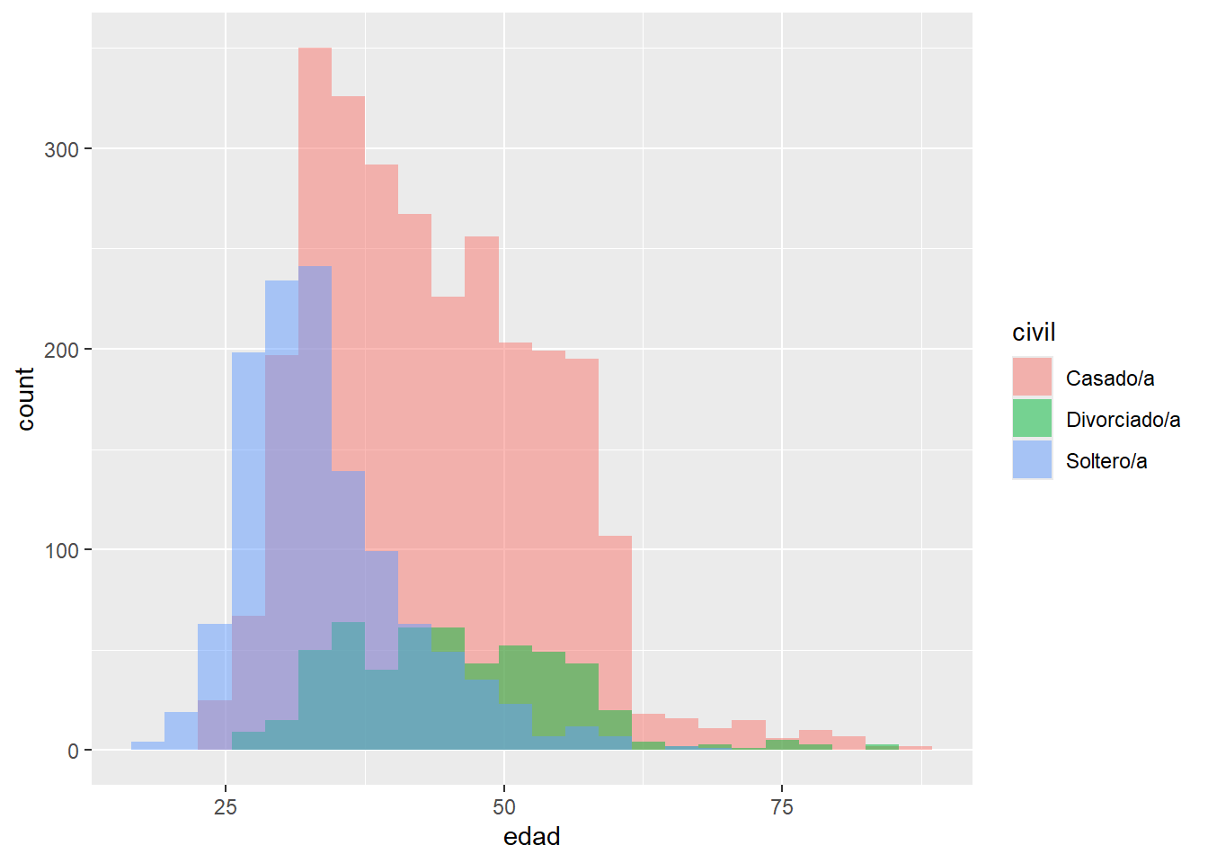 ggplot(datos_mkt, aes(x = edad, fill = civil)) +